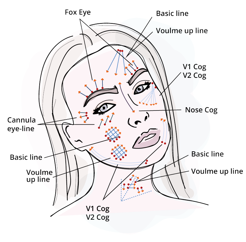 Eine Kombination aus Nahtmaterial und verschiedenen Universal-kanülen. Die Nadeln werden mit dem absorbierenden Fäden in die tiefen Hautschichten eingeführt, sodass die Fäden in der Haut bestehen bleiben. Dadurch wird der natürliche Regenerationsprozess und die mechanische Stimulation der Wundheilung und der Gewebekontraktion aktiviert. Die Haut und das Gewebe werden gestrafft, natürliche Gesichtszüge bleiben erhalten. Studien zeigen, dass eine Behandlung durch PDO- und PLA-Fäden sehr sicher ist. Die PDO-Fäden bauen sich innerhalb von ca. 12 Monaten ab, die PLA-Fäden innerhalb von ca. 24 Monaten.